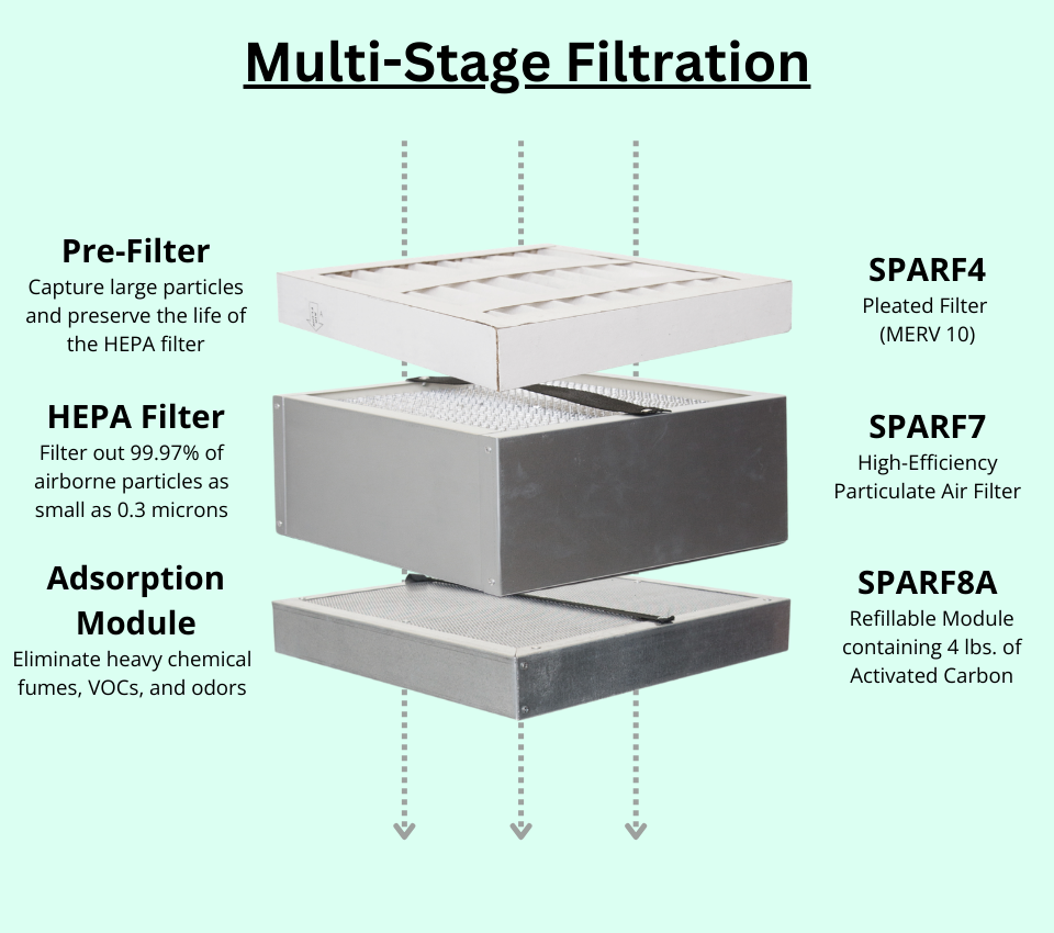 The SPA-AMB2 Salon Air Cleaner effectively removes submicron particulates as well as heavy chemical vapors: including—but not limited to—ethyl methacrylate (EMA), titanium dioxide, benzoyl peroxide, methacrylic acid, polymethyl methacrylate (PMMA), and acetone. This compact fume extractor offers superior multi-stage filtration, with a 99.97% efficient HEPA filter and refillable adsorption module containing 4 lbs. of activated carbon