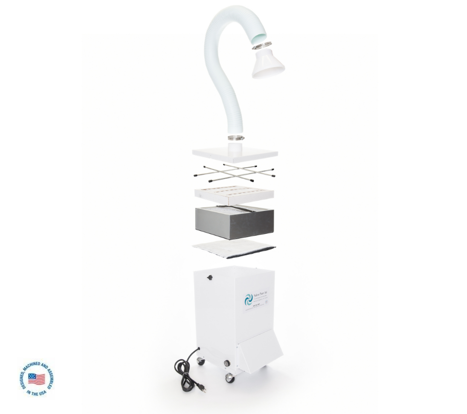 The Extract-All® Salon Pure Air Revolution effectively removes submicron particulates as well as heavy chemical vapors: including—but not limited to—ethyl methacrylate (EMA), titanium dioxide, benzoyl peroxide, methacrylic acid, polymethyl methacrylate (PMMA), and acetone. This compact fume extractor for nail salons offers superior multi-stage filtration, with a 99.97% efficient HEPA filter and a multi-density polyester panel filter with activated carbon.