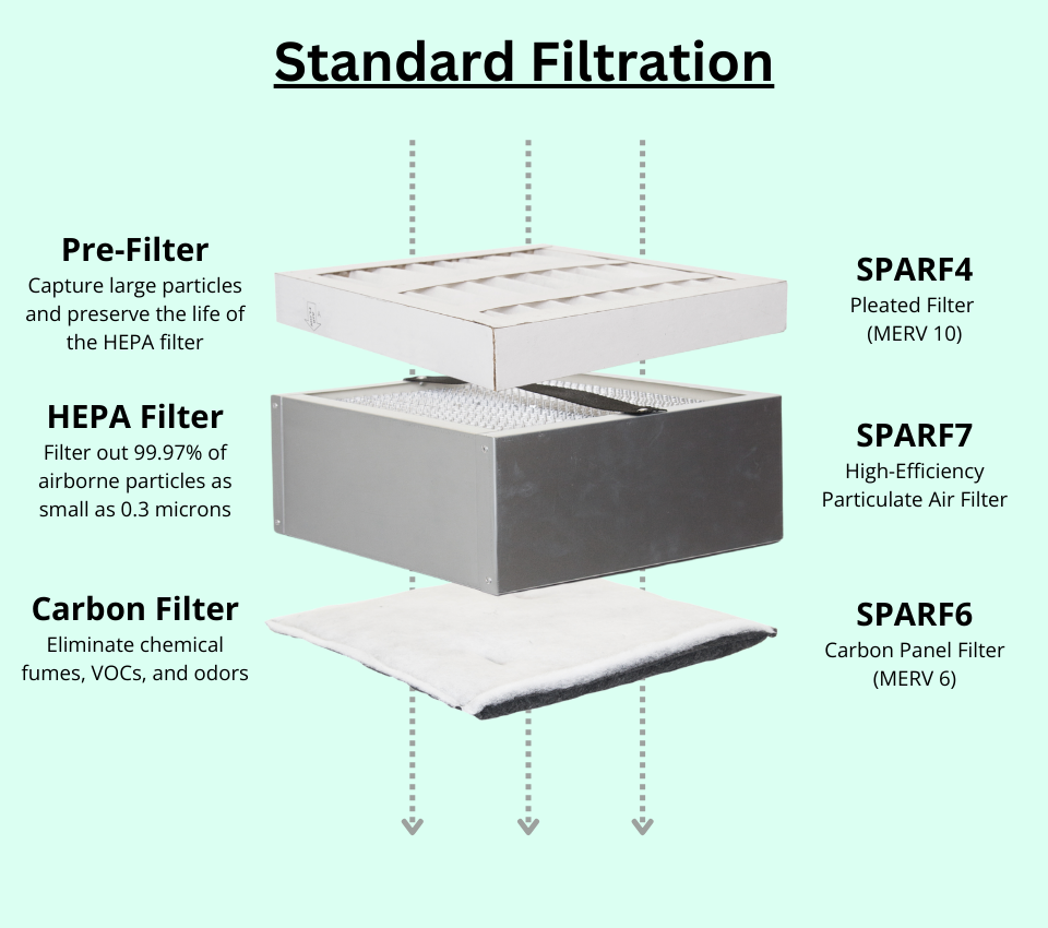 Users looking for even longer lasting high-efficiency chemical removal can select the Upgraded Filter Package, which substitutes our SPARF6 Activated Carbon Panel Filter with the SPARF8A Refillable Carbon Adsorption Module. With just a few pounds of additional activated carbon, the Upgraded Filter Package can remove up to 4x the amount of VOCs over its lifetime.